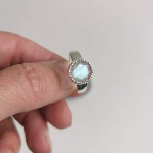 The deep blue Topaz is ring size 17,5 mm, the grey blue Topaz is ring size 17,75 mm